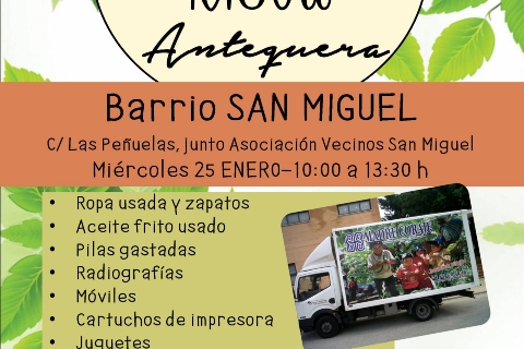 El miércoles 25 de enero, de 10,00 a 13,30 horas, el Punto Limpio Móvil de Madre Coraje estará en el Barrio San Miguel de Antequera cumpliendo así a su cita con el reciclado que desde el año 2013...