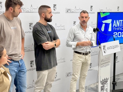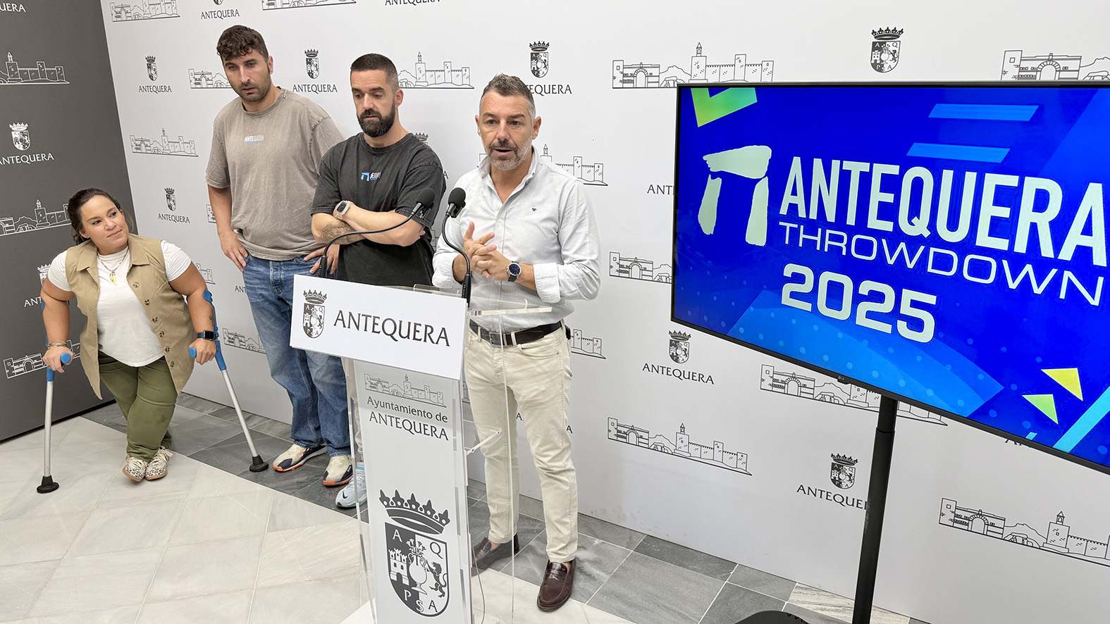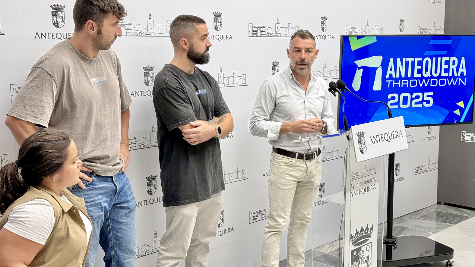 El teniente de alcalde delegado de Deportes, Juan Rosas, y Fermín Sánchez, en representación de la organización, han presentado hoy jueves en rueda de prensa el inminente desarrollo de la segunda edición del "Antequera Throwdown", competición de entrenamiento funcional que reunirá a unos 500 atletas procedentes de toda Andalucía. También ha estado presente en la rueda de prensa la concejal Sara Ríos.