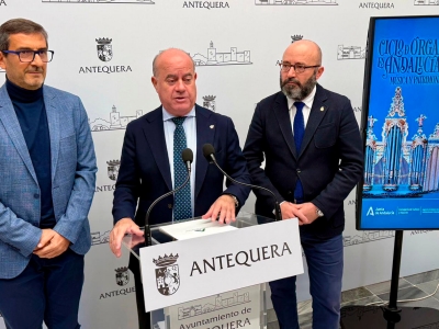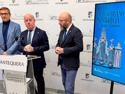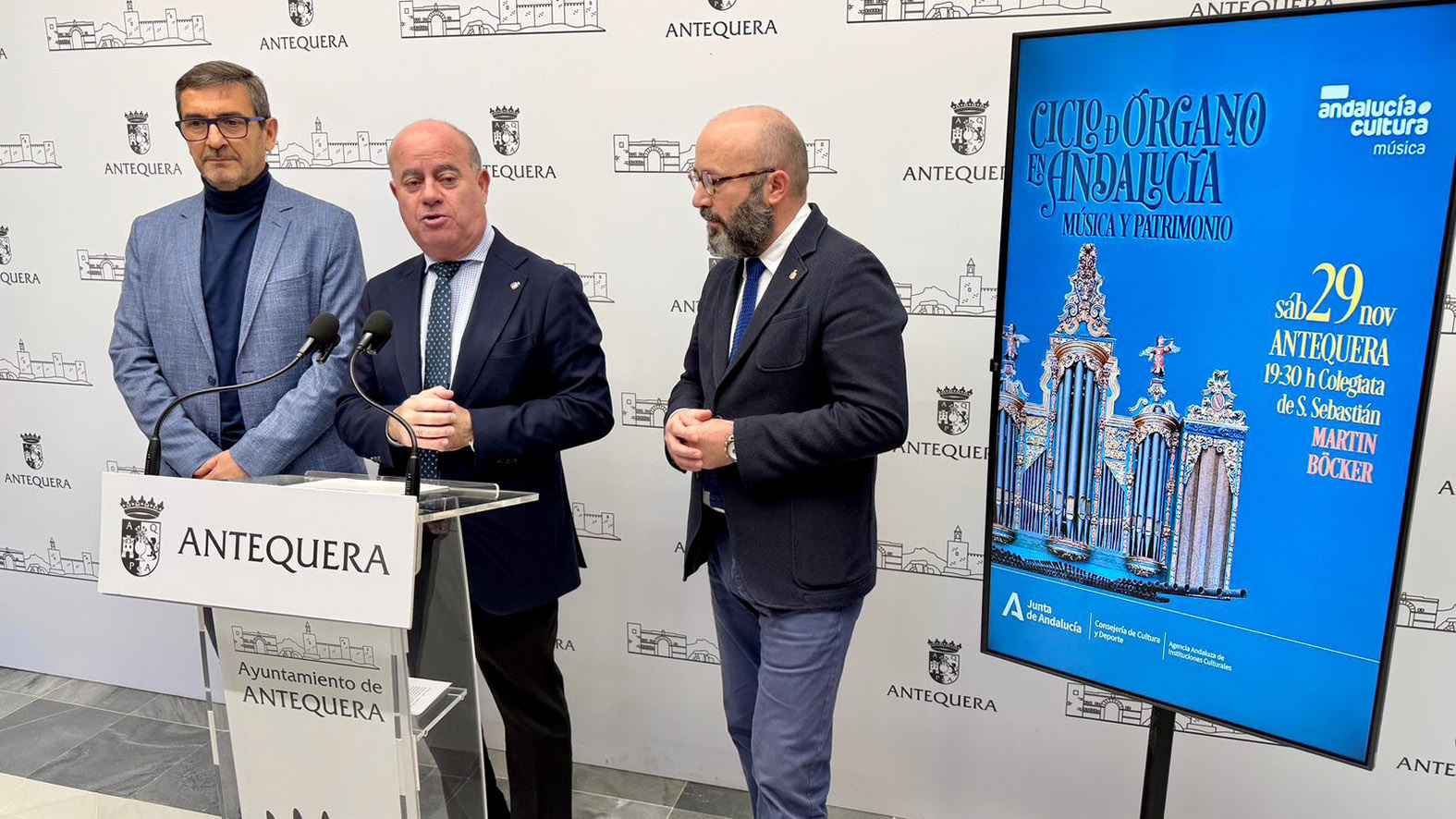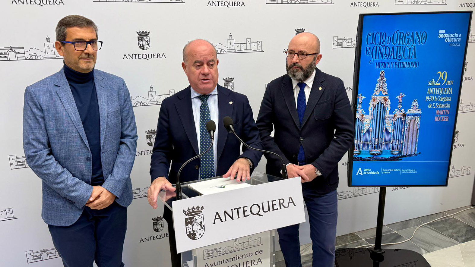 El alcalde de Antequera, Manolo Barón, junto al delegado territorial de Cultura de la Junta de Andalucía, Carlos García, y el concejal de Cultura, José Medina Galeote, han presentado en rueda de prensa el concierto del Ciclo de Órgano en Andalucía: Música y Patrimonio, iniciativa cultural de la Consejería de Cultura y Deporte que desarrolla durante los meses de noviembre y diciembre una programación de conciertos en órganos históricos de toda la comunidad.