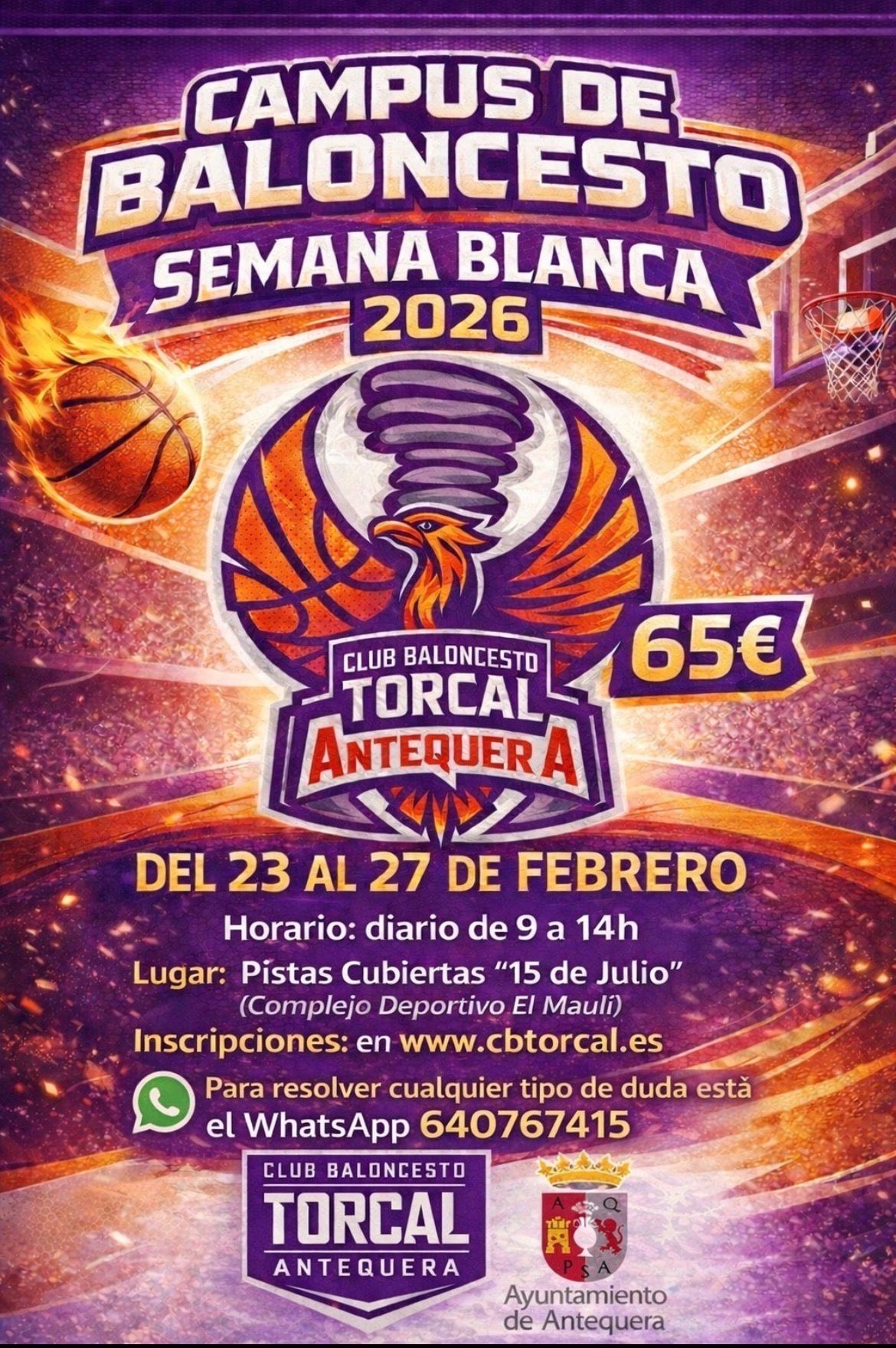 Campus que se desarrollará en horario de 09.00h a 14.00h en las Pistas Cubiertas del Pabellón ‘15 de Julio’, en el Complejo Deportivo El Maulí. Las inscripciones se pueden formalizar en www.cbtorcal.es. Para resolver cualquier tipo de duda, se puede contactar a través de WhatsApp en el 640767415. Precio 65 euros.