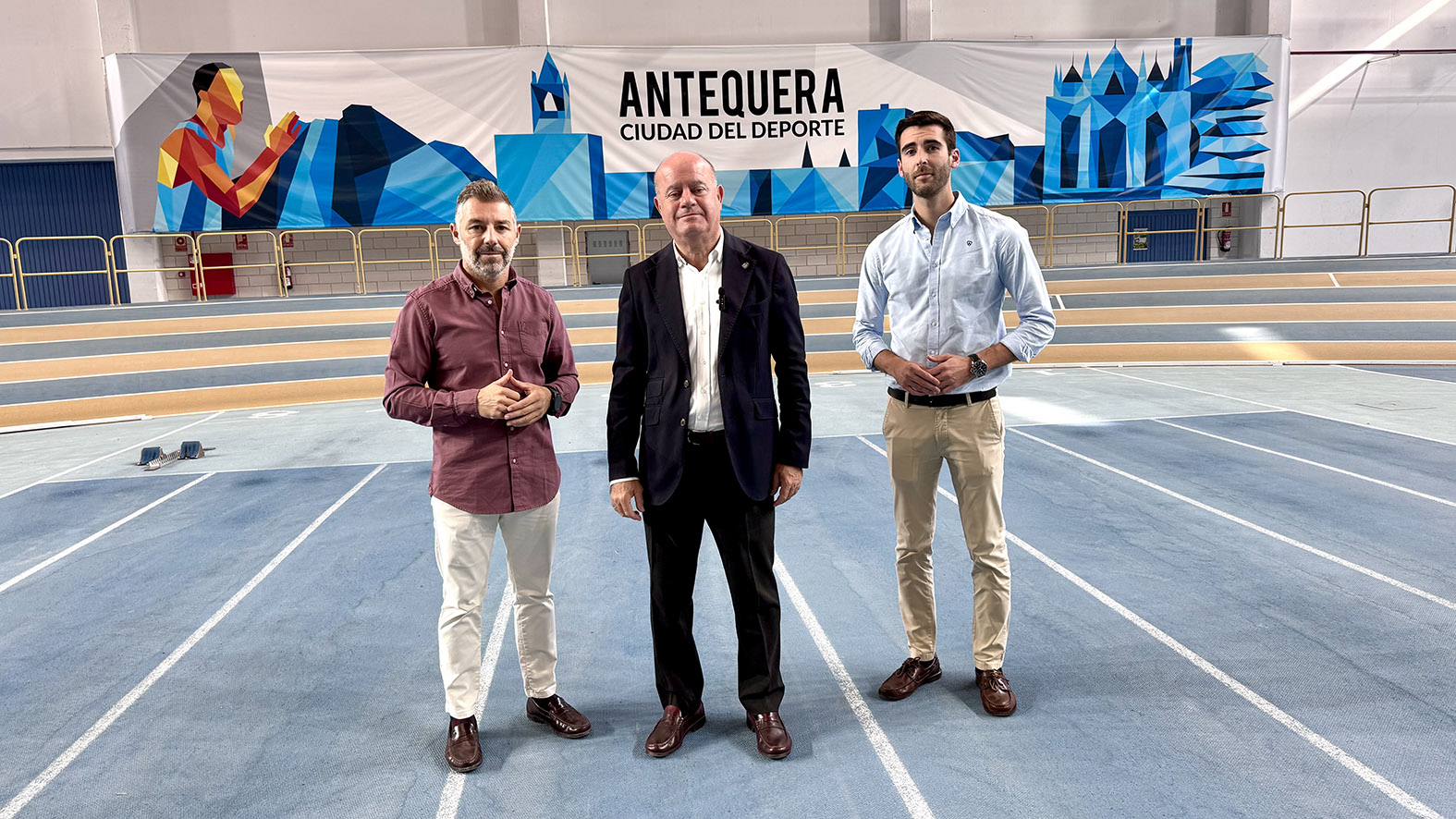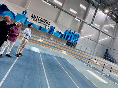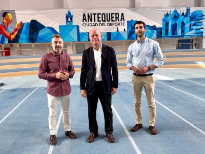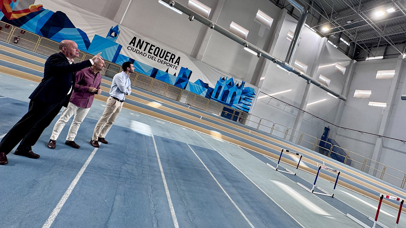 El alcalde de Antequera, Manolo Barón, junto al teniente de alcalde de Deportes, Juan Rosas, y el teniente de alcalde delegado de Eficiencia Energética, José Manuel Fernández, han visitado el Centro de Tecnificación de Atletismo para informar sobre las mejoras que se están llevando a cabo en el sistema de iluminación de sus instalaciones.