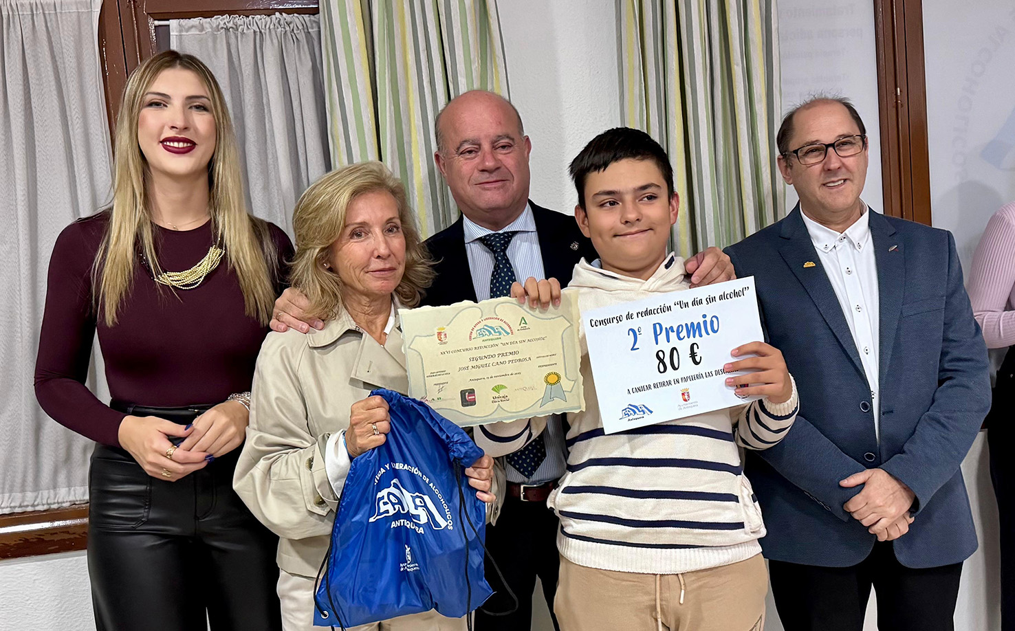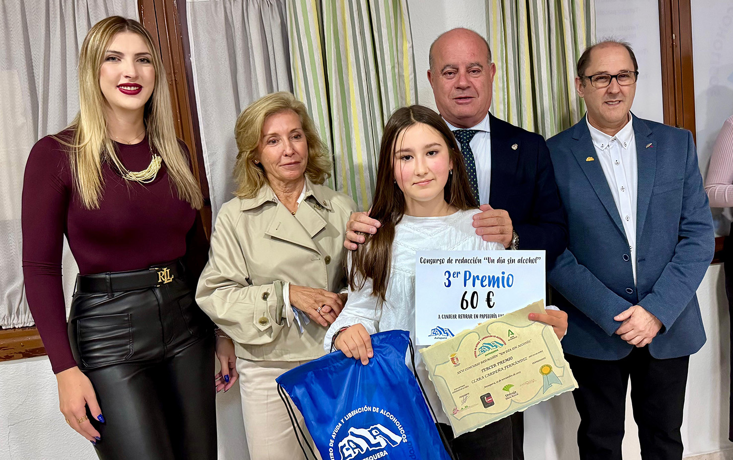 El alcalde de Antequera, Manolo Barón, ha presidido este sábado 15 de noviembre el acto de entrega del Concurso de Redacción “Un Día sin Alcohol”, una iniciativa anual promovida por la asociación CALA con el fin de concienciar al alumnado de Secundaria sobre los riesgos del consumo de alcohol y reforzar hábitos de vida saludables. El acto ha contado igualmente con la participación del presidente de CALA, Juan Antonio González, así como de la concejal de Juventud, Marta González, y la concejal de Salud, María Enriles.