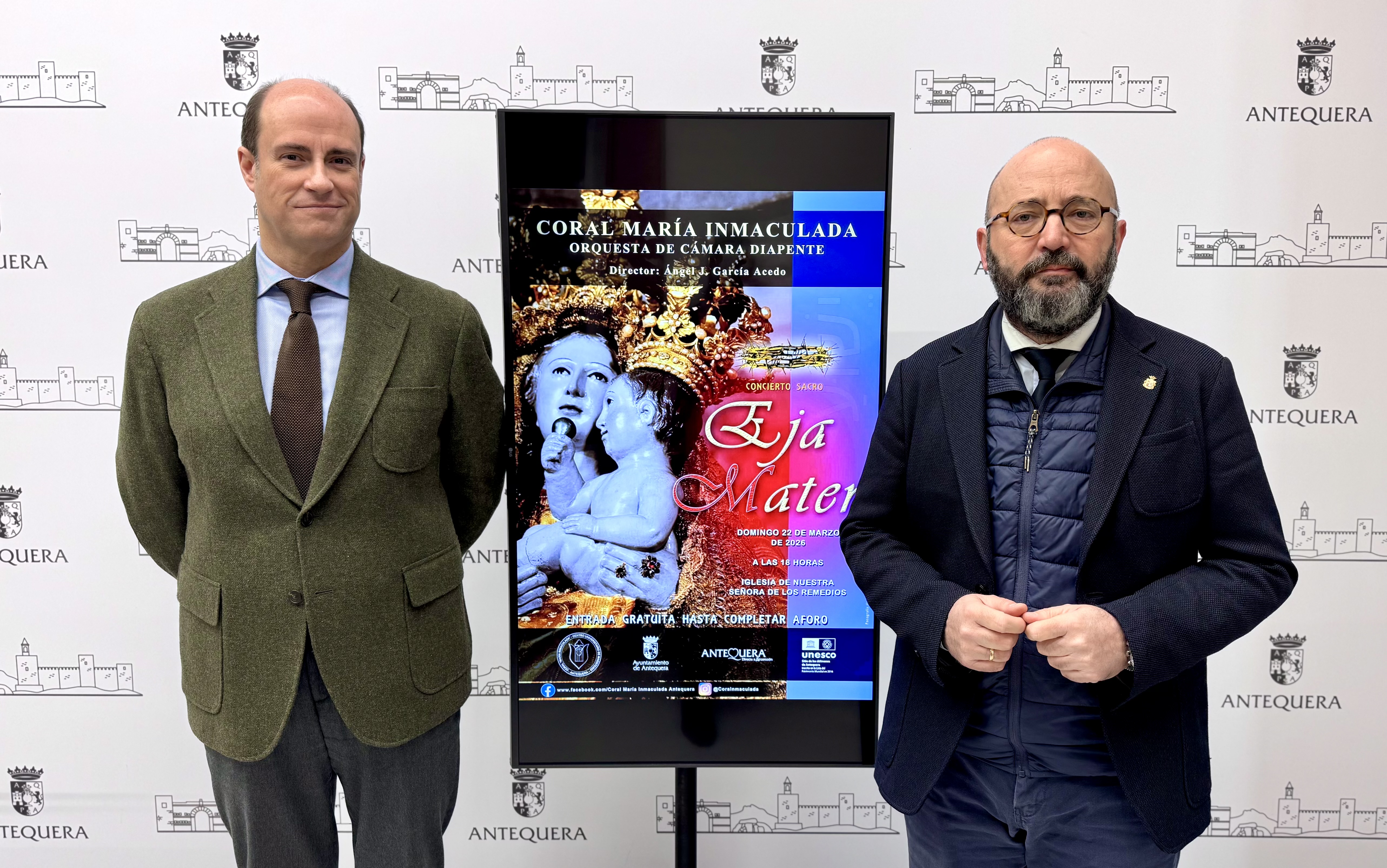 El responsable de Cultura del Ayuntamiento de Antequera, José Medina Galeote, y el presidente de la Coral María Inmaculada, Juan Antonio Sánchez, han presentado en rueda de prensa la actividad.