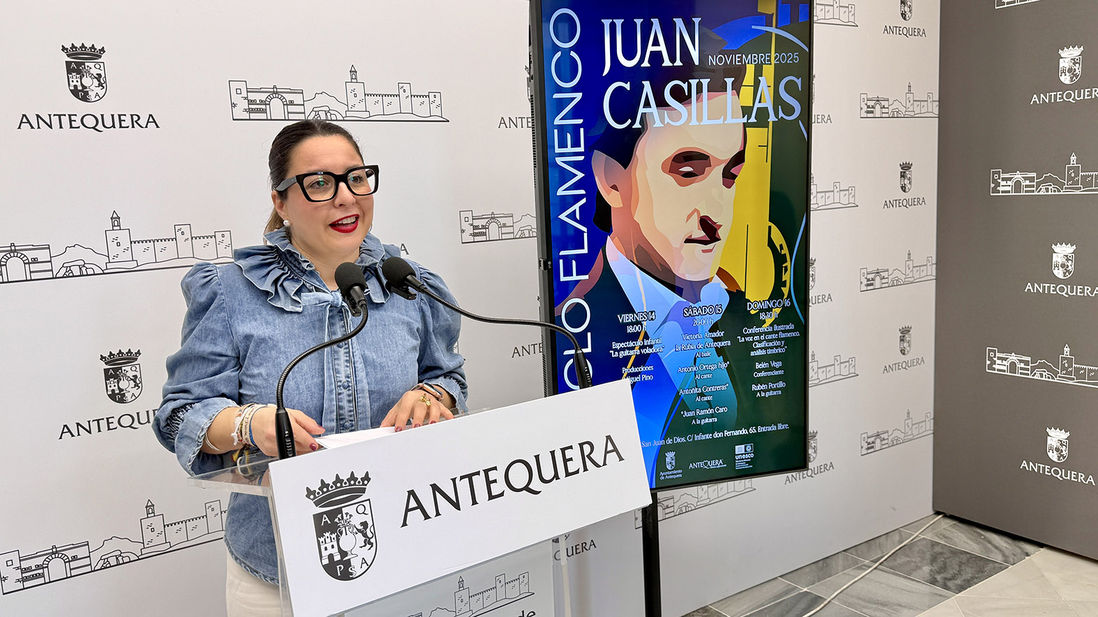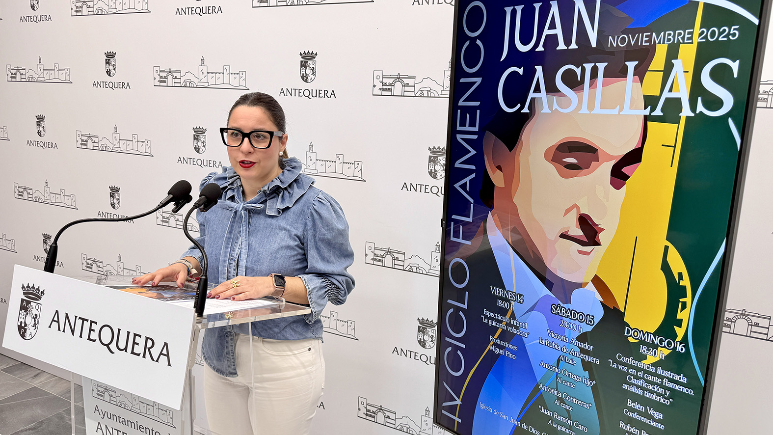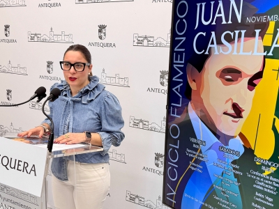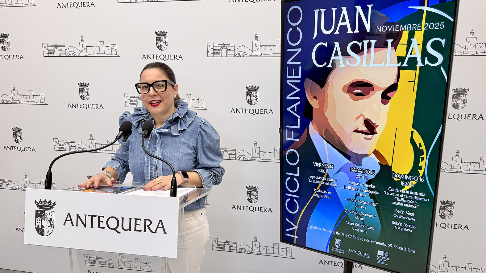 El Área de Fiestas Mayores, Tradiciones y Promoción del Flamenco del Ayuntamiento de Antequera organiza una nueva edición del ciclo dedicado a la figura del cantaor antequerano Juan Casillas, con un programa que combina cante, baile, divulgación y actividades para el público infantil. La teniente de alcalde Elena Melero ha sido la encargada de presentar esta cuarta edición, que consolida el homenaje a una de las voces más recordadas del flamenco local.