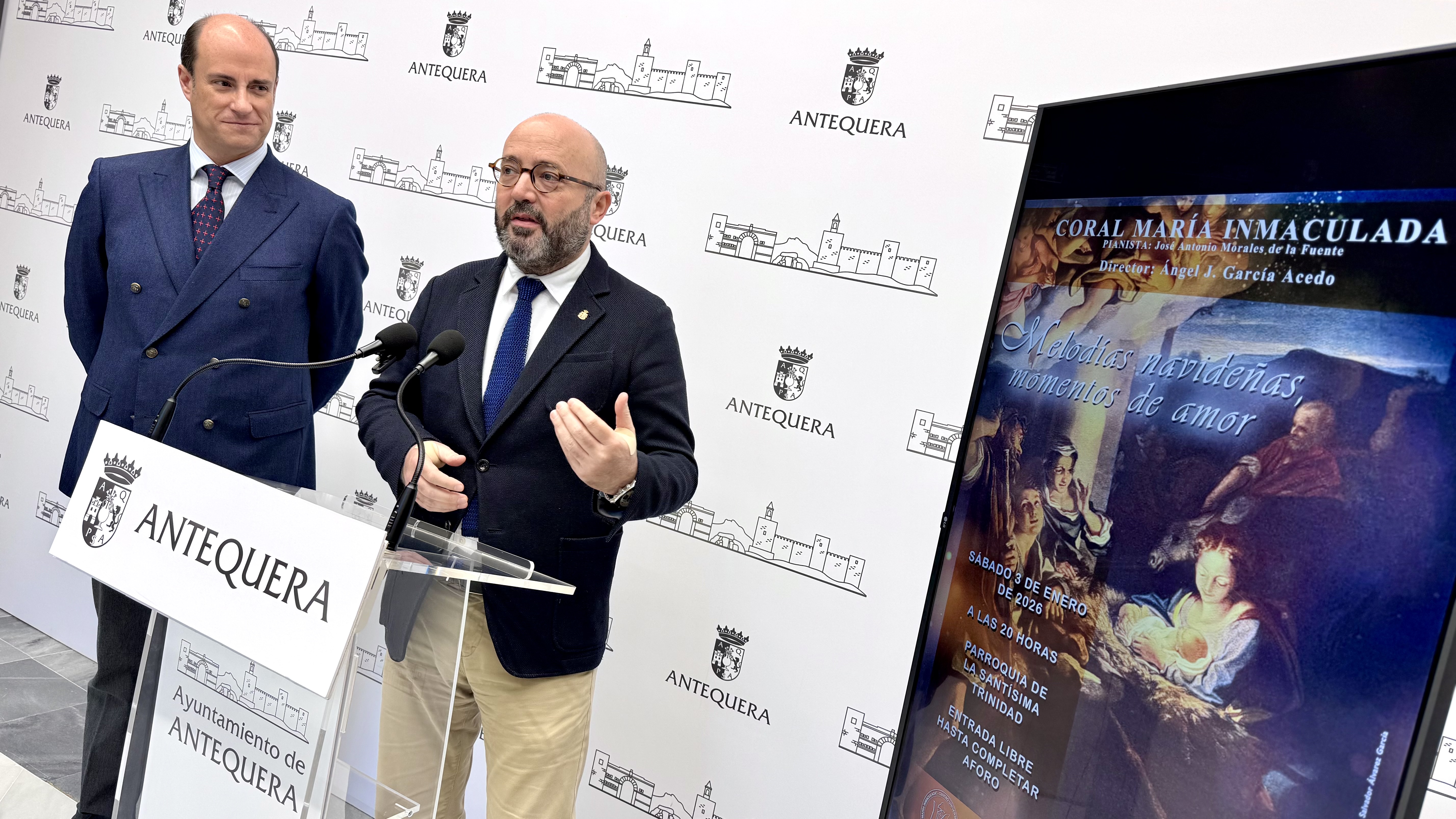 El responsable de Cultura del Ayuntamiento de Antequera, José Medina Galeote, y el presidente de la Coral María Inmaculada, Juan Antonio Sánchez, han presentado una nueva edición del tradicional Concierto de Navidad de la Coral María Inmaculada bajo el título de 'Melodías navideñas, momentos de amor'.